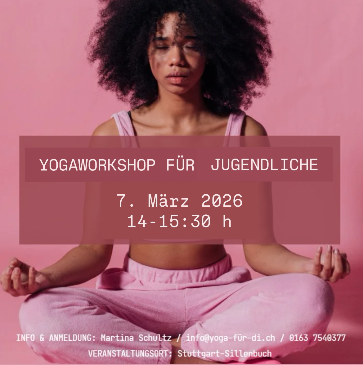 7. März 2026 Yoga-Workshop für JUGENDLICHE 7. März 2026 Yoga-Workshop für JUGENDLICHE 17. Dezember 2025 Martina Schultz Am 7. März 2026 findet von 14:00 – 15:30 Uhr ein Yogaworkshop für Jugendliche statt. Dieser Workshop ist für Anfänger sowie Fortgeschrittene geeignet. Alle Infos findest du hier …